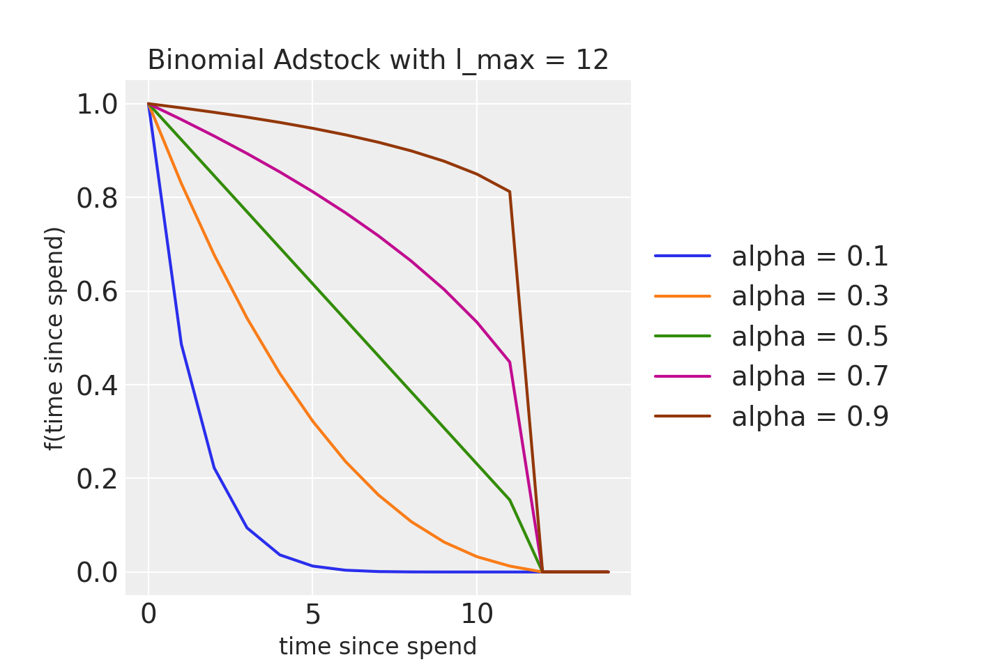 Binomial adstock assumes that the effect of one unit of spend at time \(0 \le t \le l_{max} + 1\) is given by