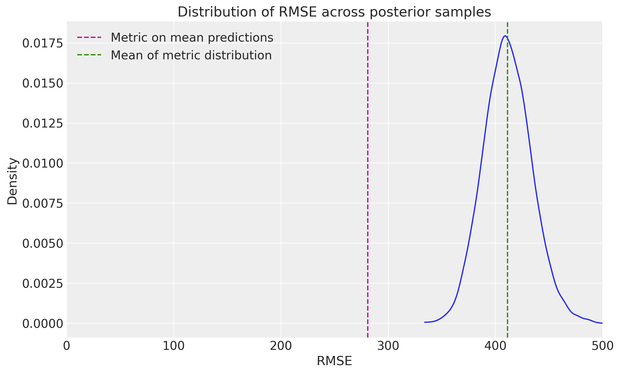 1. E[f(x)] is not guaranteed to be f(E[x]): This means calculating metrics on mean predictions can give different (and potentially misleading) results compared to calculating the distribution of metrics across posterior samples.